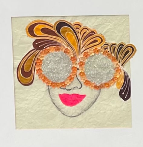 This playful original artwork depicts a face with glittery circular eyes and a stylized hair made of curving shapes in warm tones. The piece has a lighthearted, transformative quality that could represent the fluid and ever-changing nature of identity.